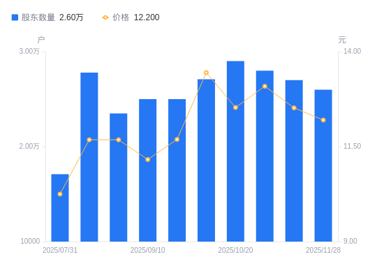 近一年(2024年11月29日至2025年11月28日),佛燃能源A股股东户数从1.95万户,增加至2.6万户,增幅33.33%,区间股价上涨5.45%。