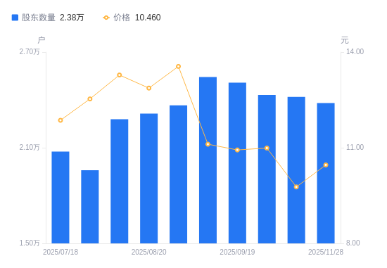 近一年(2024年11月30日至2025年11月28日),美联新材A股股东户数从3.1万户,减低至2.38万户,降幅23.12%,区间股价上涨4.18%。