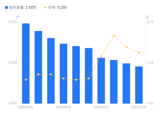 近一年(2024年12月10日至2025年12月5日),龙泉股份A股股东户数从2.82万户,减低至2.33万户,降幅17.35%,区间股价上涨11.50%。