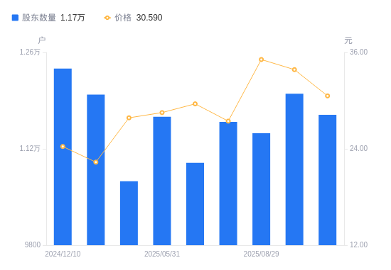 近一年(2024年12月10日至2025年11月28日),迪阿股份A股股东户数从1.24万户,减低至1.17万户,降幅5.42%,区间股价上涨26.93%。