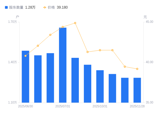 近一年(2024年12月20日至2025年11月28日),朗威股份A股股东户数从1.52万户,减低至1.28万户,降幅15.36%,区间股价上涨10.21%。