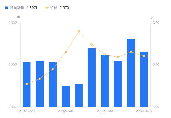 近一年(2024年11月29日至2025年11月28日),福星股份A股股东户数从4.68万户,减低至4.39万户,降幅6.20%,区间股价下跌8.21%。