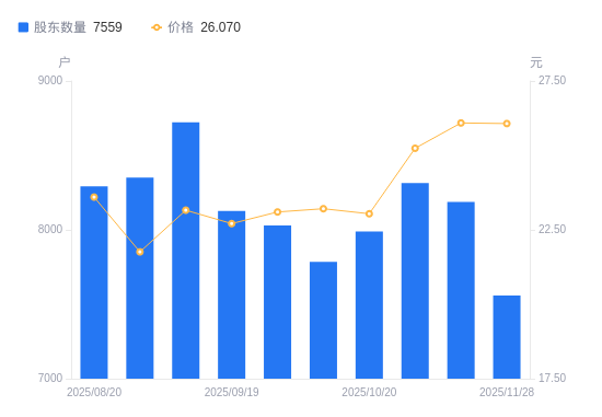 近一年(2024年12月10日至2025年11月28日),楚环科技A股股东户数从9354户,减低至7559户,降幅19.19%,区间股价上涨23.72%。