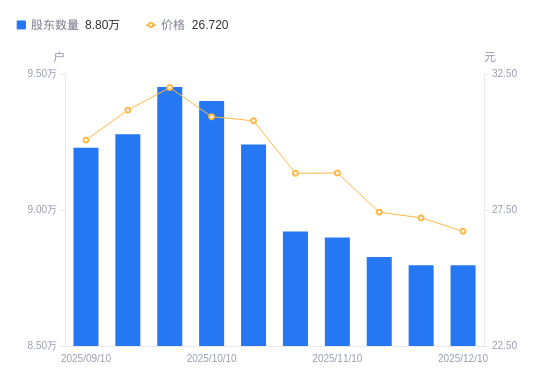 近一年(2024年12月10日至2025年12月10日),捷捷微电A股股东户数从11.48万户,减低至8.8万户,降幅23.39%,区间股价下跌28.33%。