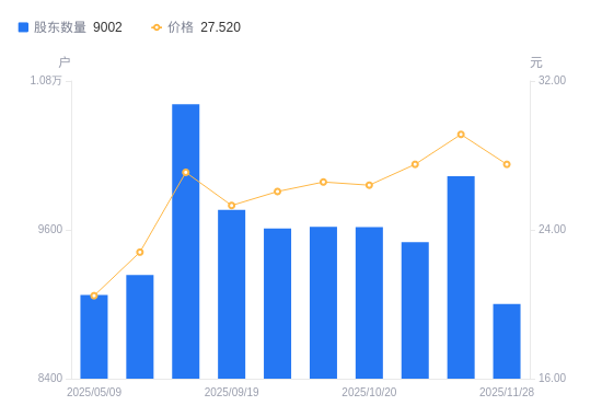 近一年(2024年12月31日至2025年11月28日),科净源A股股东户数从9135户,减低至9002户,降幅1.46%,区间股价上涨33.59%。
