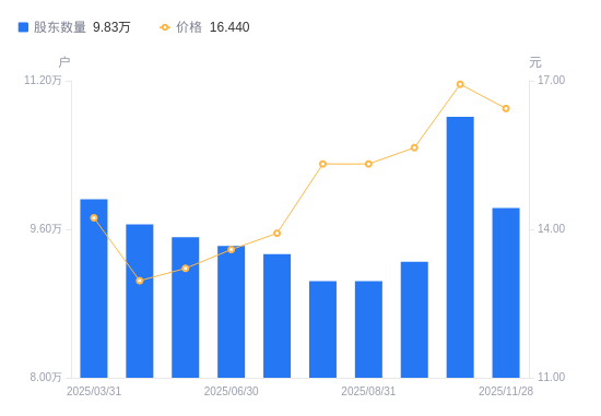 近一年(2024年11月29日至2025年11月28日),风华高科A股股东户数从9.49万户,增加至9.83万户,增幅3.61%,区间股价上涨9.74%。