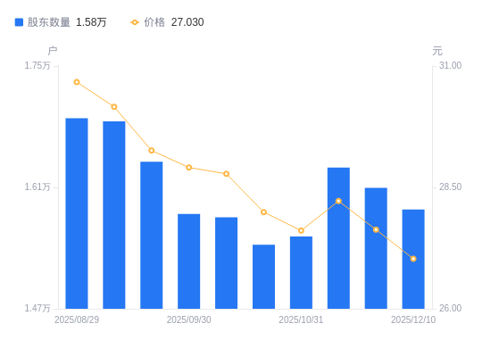 近一年(2024年12月20日至2025年12月10日),三元生物A股股东户数从1.45万户,增加至1.58万户,增幅9.63%,区间股价上涨4.20%。