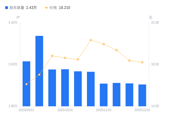 近一年(2024年12月31日至2025年12月10日),和胜股份A股股东户数从2.95万户,减低至2.43万户,降幅17.69%,区间股价上涨11.65%。