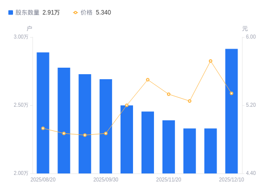 近一年(2024年12月10日至2025年12月10日),龙泉股份A股股东户数从2.82万户,增加至2.91万户,增幅3.34%,区间股价上涨4.09%。
