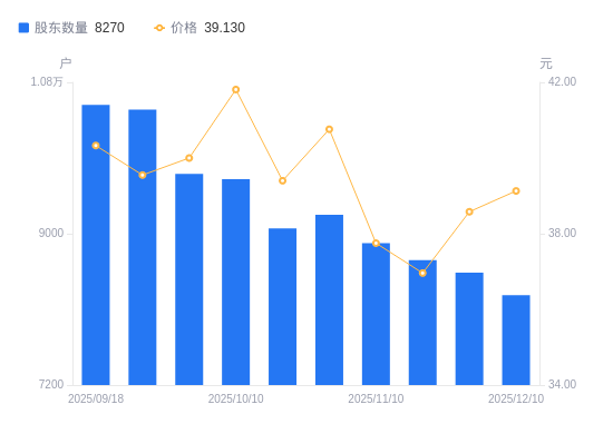 近一年(2024年12月20日至2025年12月10日),创益通A股股东户数从1.91万户,减低至8270户,降幅56.77%,区间股价上涨83.11%。