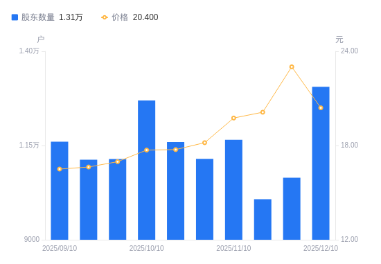 近一年(2024年12月10日至2025年12月10日),百胜智能A股股东户数从1.27万户,增加至1.31万户,增幅2.79%,区间股价上涨24.85%。