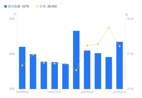 近一年(2024年12月10日至2025年12月10日),大地海洋A股股东户数从2743户,增加至4279户,增幅56.00%,区间股价上涨17.05%。