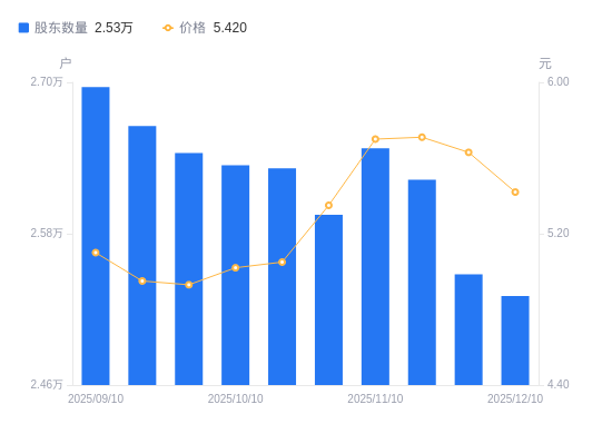 近一年(2024年12月10日至2025年12月10日),华斯股份A股股东户数从2.79万户,减低至2.53万户,降幅9.15%,区间股价上涨18.60%。