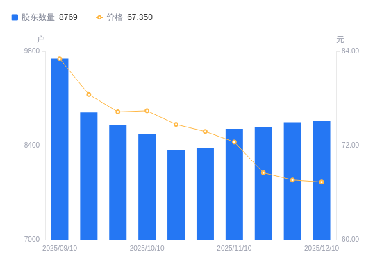 近一年(2024年12月20日至2025年12月10日),港迪技术A股股东户数从1.31万户,减低至8769户,降幅33.01%,区间股价下跌22.70%。