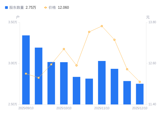 近一年(2024年12月10日至2025年12月10日),沃顿科技A股股东户数从2.53万户,增加至2.75万户,增幅8.69%,区间股价上涨29.36%。