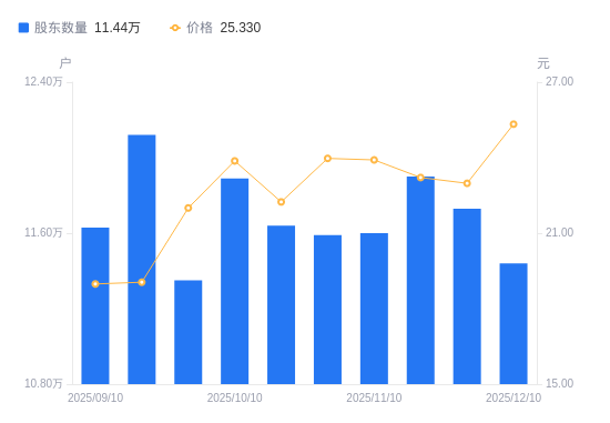 12月11日消息,数据显示,截至2025年12月10日,西部矿业A股股东总户数为11.44万户,较上期(2025年11月28日)减少2900户,降幅2.47%。公司最新A股总股本为23.83亿股,其中流通A股23.83亿股,户均持有流通A股数量为2.08万股,较上期增加514.99股,增幅2.53%;户均持流通A股市值52.76万元,较上期增加6.08万元,增幅13.02%。