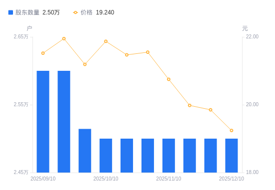 近一年(2024年12月20日至2025年12月10日),瑞普生物A股股东户数从1.6万户,增加至2.5万户,增幅56.25%,区间股价上涨1.98%。