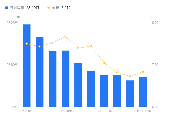 近一年(2024年12月10日至2025年12月10日),第一创业A股股东户数从35.27万户,减低至23.4万户,降幅33.66%,区间股价下跌19.20%。