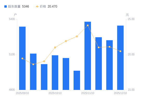 近一年(2024年12月10日至2025年12月10日),*ST和科A股股东户数从6869户,减低至5346户,降幅22.17%,区间股价下跌4.61%。