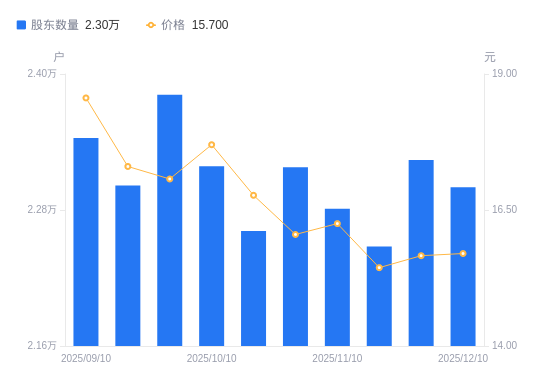 近一年(2024年12月10日至2025年12月10日),钱江摩托A股股东户数从2.5万户,减低至2.3万户,降幅8.14%,区间股价下跌2.61%。