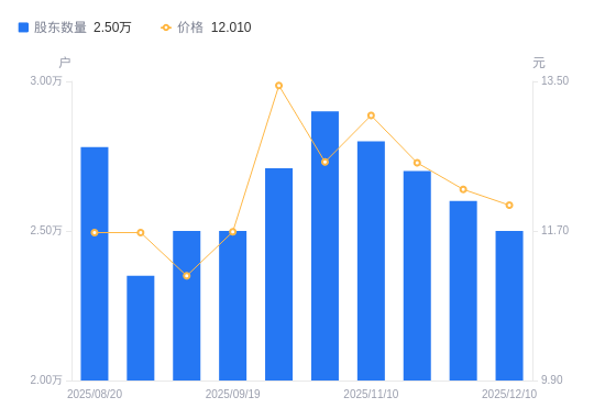 近一年(2024年12月20日至2025年12月10日),佛燃能源A股股东户数从1.75万户,增加至2.5万户,增幅42.86%,区间股价上涨4.89%。