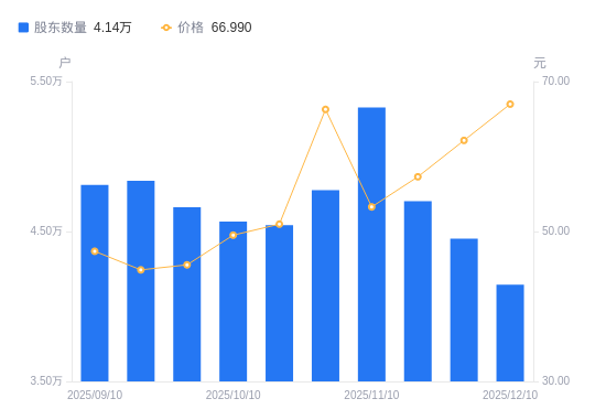 近一年(2024年12月31日至2025年12月10日),常山药业A股股东户数从3.92万户,增加至4.14万户,增幅5.70%,区间股价上涨233.78%。