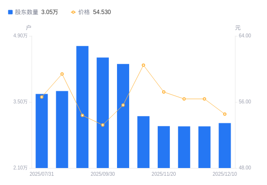 近一年(2024年12月20日至2025年12月10日),中宠股份A股股东户数从2.38万户,增加至3.05万户,增幅28.38%,区间股价上涨73.99%。