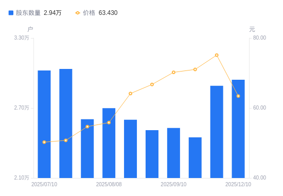 近一年(2024年12月10日至2025年12月10日),腾远钴业A股股东户数从2.81万户,增加至2.94万户,增幅4.61%,区间股价上涨31.88%。