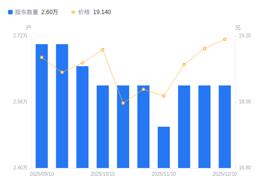 近一年(2024年12月10日至2025年12月10日),会畅通讯A股股东户数从3.08万户,减低至2.6万户,降幅15.58%,区间股价下跌18.27%。