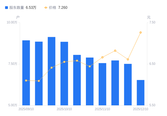 近一年(2024年12月10日至2025年12月10日),大连重工A股股东户数从7.02万户,减低至6.53万户,降幅6.93%,区间股价上涨36.21%。