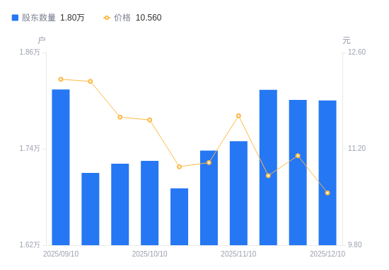 近一年(2024年12月20日至2025年12月10日),聚合顺A股股东户数从1.35万户,增加至1.8万户,增幅32.94%,区间股价下跌6.19%。