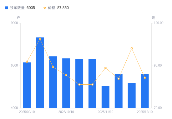 近一年(2024年12月20日至2025年12月10日),凯迪股份A股股东户数从7800户,减低至6005户,降幅23.01%,区间股价上涨147.85%。
