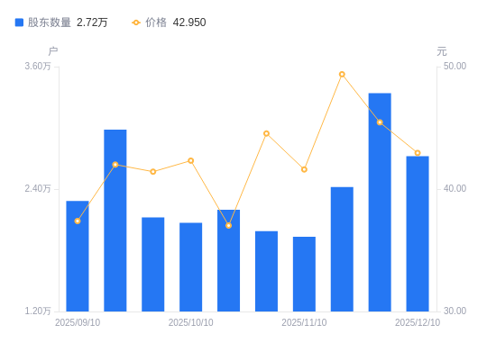 近一年(2024年12月10日至2025年12月10日),中一科技A股股东户数从1.55万户,增加至2.72万户,增幅75.84%,区间股价上涨122.30%。