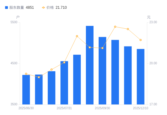 近一年(2024年12月20日至2025年12月10日),艾隆科技A股股东户数从4004户,增加至4851户,增幅21.15%,区间股价上涨35.52%。