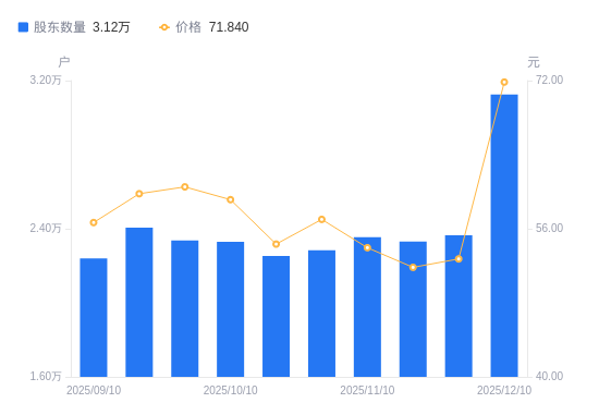 12月12日消息,数据显示,截至2025年12月10日,中瓷电子A股股东总户数为3.12万户,较上期(2025年11月28日)增加7596户,增幅32.12%。公司最新A股总股本为4.51亿股,其中流通A股3.4亿股,户均持有流通A股数量为1.09万股,较上期减少3496.8股,降幅24.31%;户均持流通A股市值78.21万元,较上期增加2.35万元,增幅3.10%。
