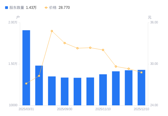 近一年(2024年12月31日至2025年12月10日),小方制药A股股东户数从2.46万户,减低至1.43万户,降幅41.96%,区间股价上涨10.87%。