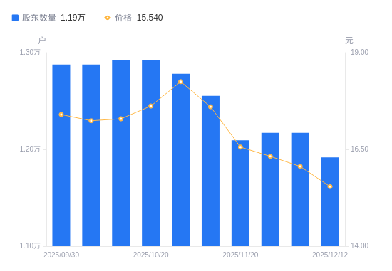 近一年(2024年12月20日至2025年12月12日),久祺股份A股股东户数从1.09万户,增加至1.19万户,增幅9.31%,区间股价上涨23.14%。
