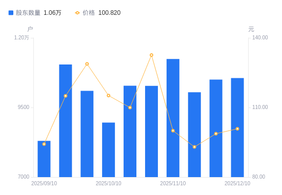 近一年(2024年12月10日至2025年12月10日),恒帅股份A股股东户数从7693户,增加至1.06万户,增幅37.23%,区间股价上涨51.20%。