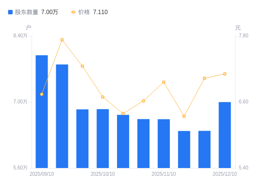 近一年(2024年12月10日至2025年12月10日),友阿股份A股股东户数从5.21万户,增加至7万户,增幅34.41%,区间股价上涨112.56%。
