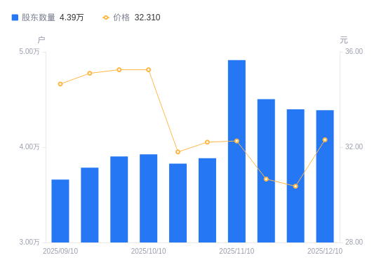 近一年(2024年12月10日至2025年12月10日),中简科技A股股东户数从3.51万户,增加至4.39万户,增幅25.02%,区间股价上涨20.78%。