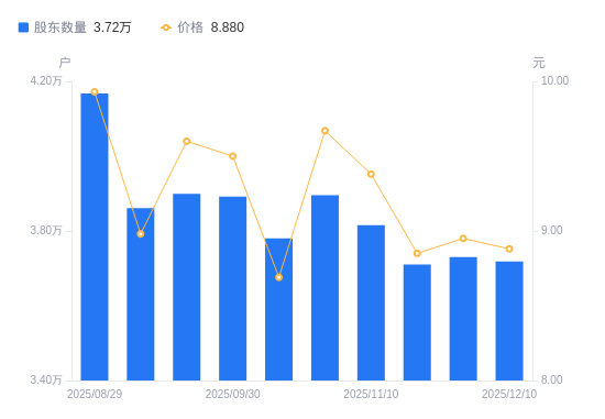 近一年(2024年12月10日至2025年12月10日),光韵达A股股东户数从4.75万户,减低至3.72万户,降幅21.65%,区间股价下跌8.36%。
