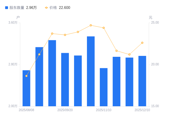 近一年(2024年12月20日至2025年12月10日),立中集团A股股东户数从2.55万户,增加至2.96万户,增幅16.27%,区间股价上涨35.70%。