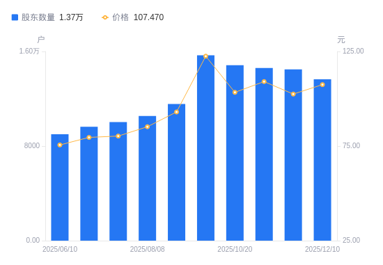 近一年(2024年12月31日至2025年12月10日),中熔电气A股股东户数从6725户,增加至1.37万户,增幅103.02%,区间股价上涨50.43%。