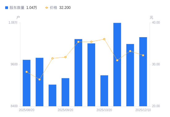 近一年(2024年12月10日至2025年12月10日),和远气体A股股东户数从1.04万户,减低至1.04万户,降幅0.38%,区间股价上涨49.21%。