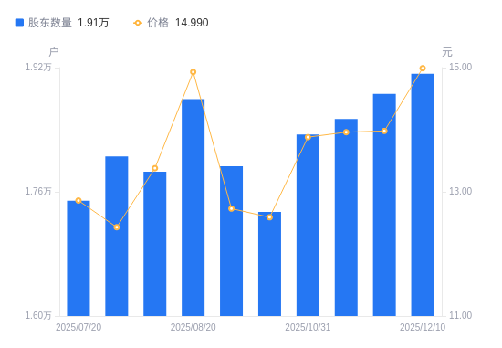 近一年(2024年12月10日至2025年12月10日),东亚机械A股股东户数从1.59万户,增加至1.91万户,增幅19.93%,区间股价上涨30.80%。