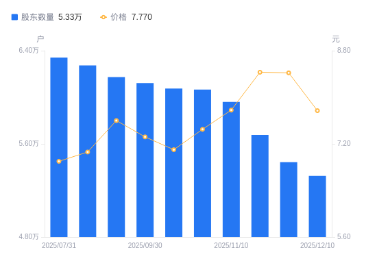 近一年(2024年12月20日至2025年12月10日),浙江美大A股股东户数从7.06万户,减低至5.33万户,降幅24.61%,区间股价上涨4.44%。