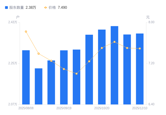 近一年(2024年12月10日至2025年12月10日),博深股份A股股东户数从2.26万户,增加至2.38万户,增幅5.26%,区间股价上涨1.90%。