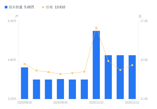 近一年(2024年12月31日至2025年12月12日),三变科技A股股东户数从2.84万户,增加至5万户,增幅75.96%,区间股价上涨20.66%。