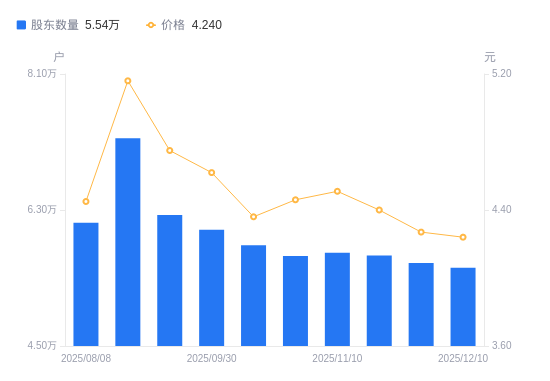 近一年(2024年12月10日至2025年12月10日),南方泵业A股股东户数从3.98万户,增加至5.54万户,增幅39.09%,区间股价上涨13.37%。