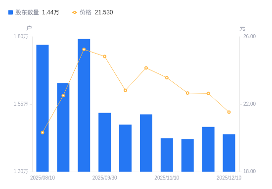 近一年(2024年12月10日至2025年12月10日),赛维时代A股股东户数从1.42万户,增加至1.44万户,增幅1.00%,区间股价下跌17.92%。